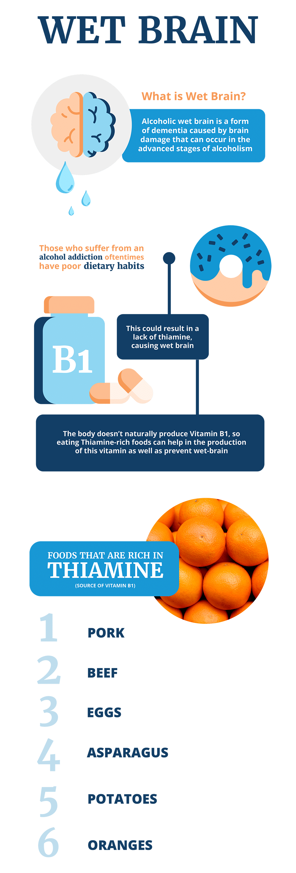 The brain also has difficulty processing large amounts of alcohol. Alcoholic wet brain is a form of dementia caused by brain damage that can occur in the advanced stages of alcoholism. Over time, this disease develops as the result of a deficiency of the vitamin thiamine.